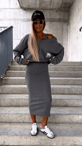 Découvrez l'élégance et le confort de l'automne et de l'hiver avec notre ensemble deux pièces très tendance. Cet ensemble comprend une jolie robe caraco tricotée avec un décolleté en V qui ajoutera une touche de sophistication à votre tenue. Son design polyvalent vous permet de la porter de manière décontractée ou plus élégante et s'adapte ainsi à toutes les occasions.