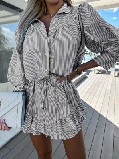 Découvrez l'ensemble deux pièces Sophie: un chemisier et une jupe élégants aux rayures joyeuses. Parfait pour toutes les occasions, de la journée au soir.