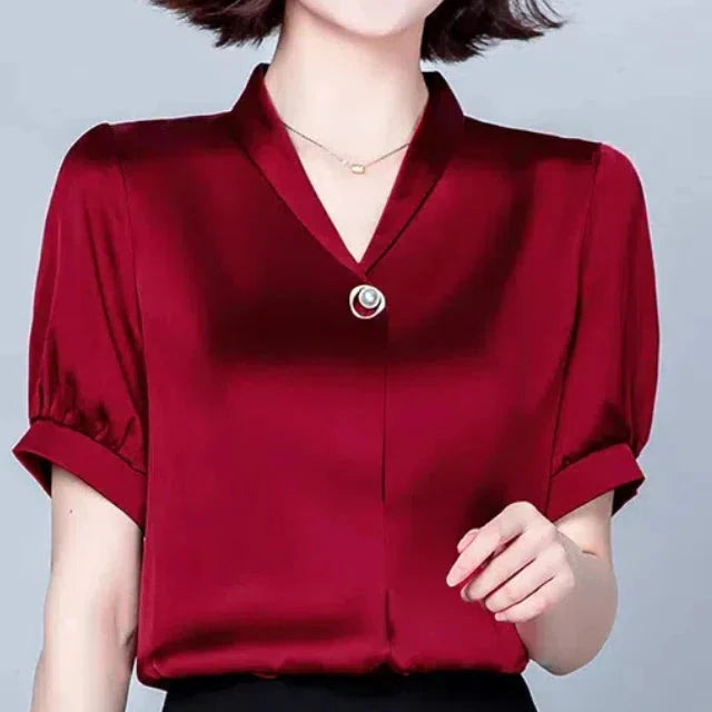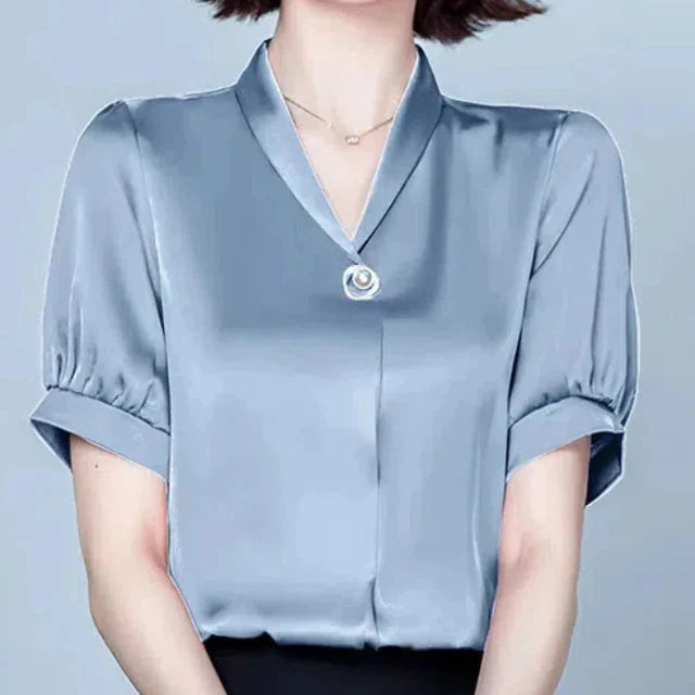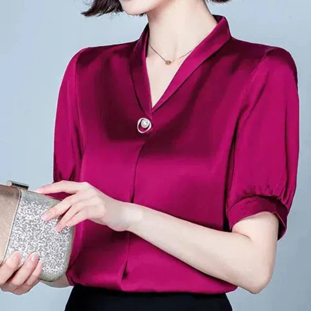 Confectionné en satin lisse, il présente d'élégantes manches bouffantes et se ferme par un délicat bouton perlé. Léger et respirant, il est parfait pour le travail ou le soir.